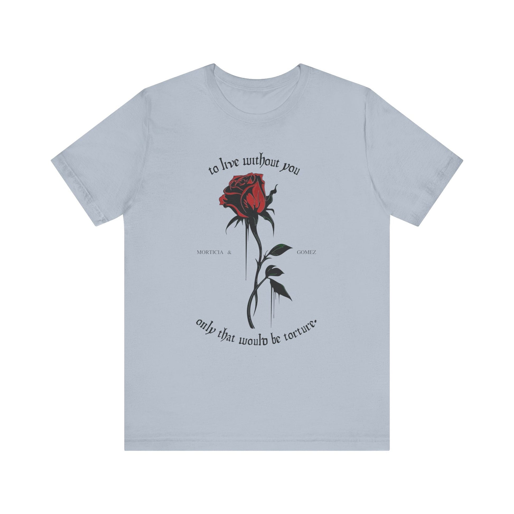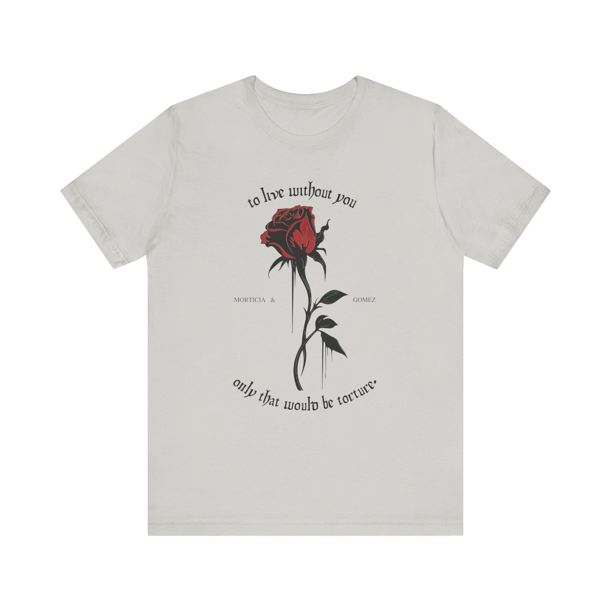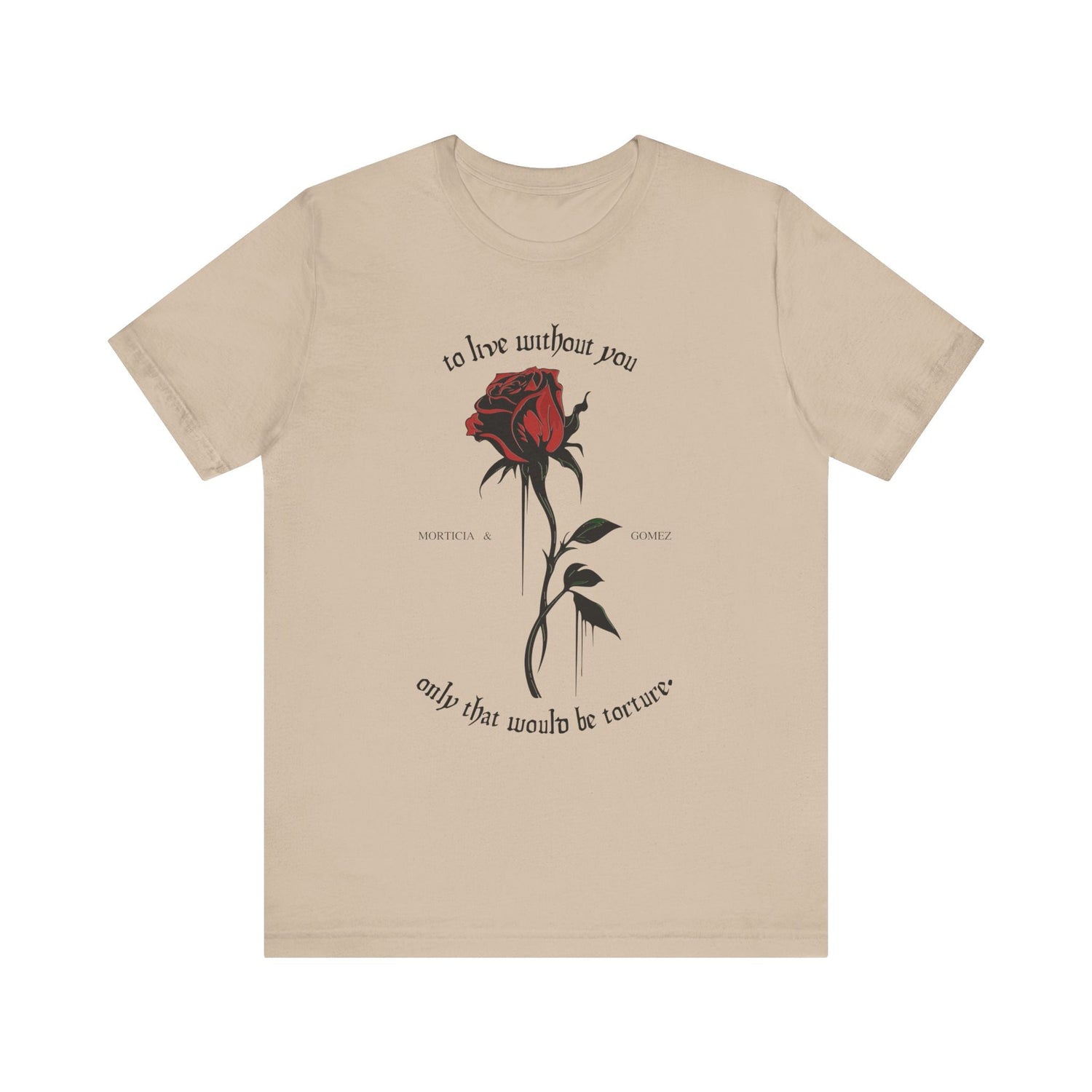 Step into a tale of gothic romance with Goth Cloth's 'To Live Without You' Gothic Rose Unisex Jersey Tee. Inspired by the timeless love story from the Addams Family.