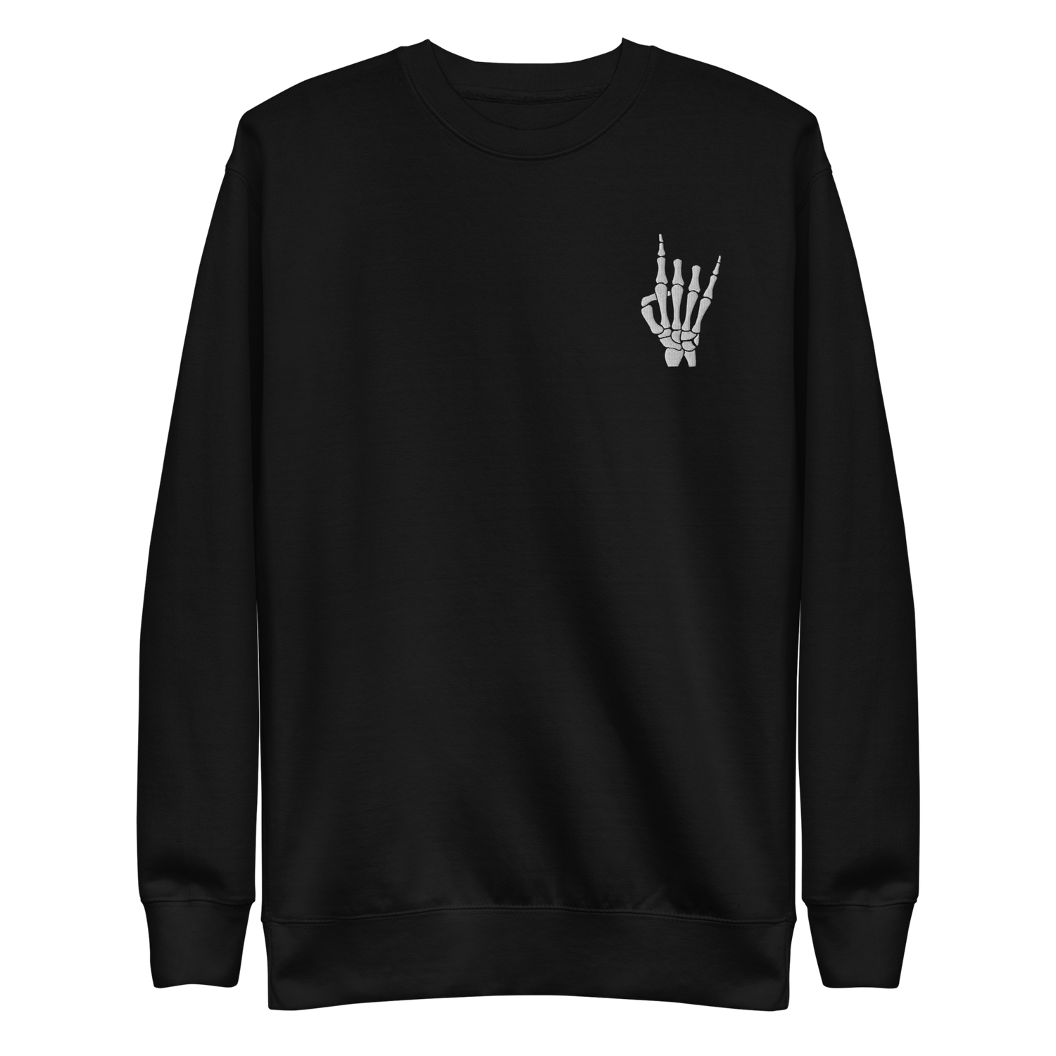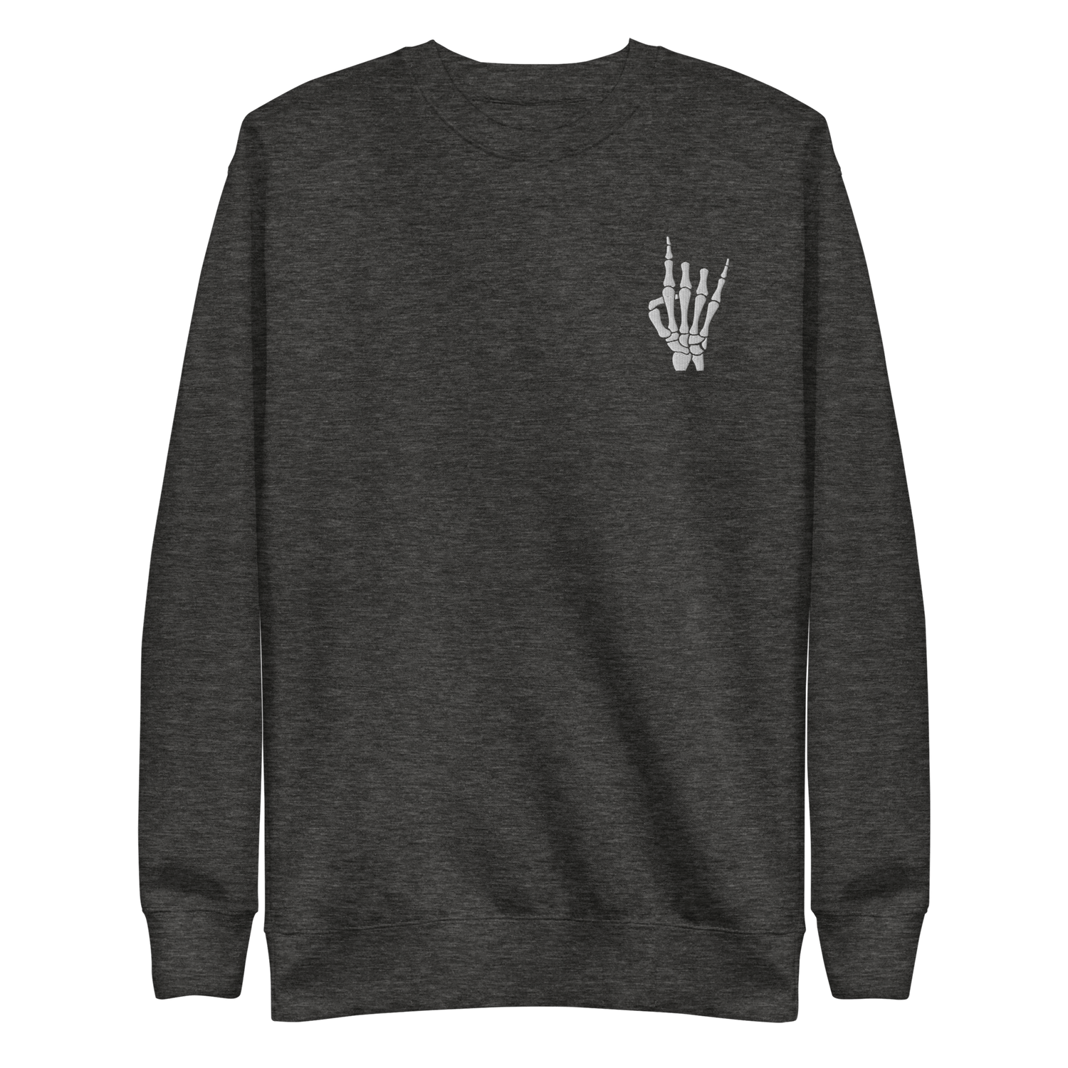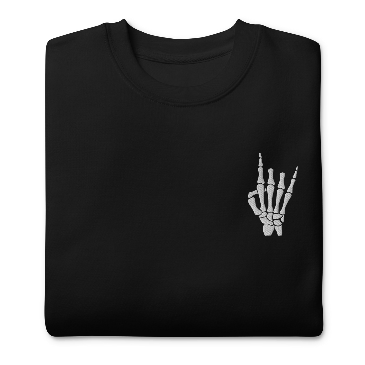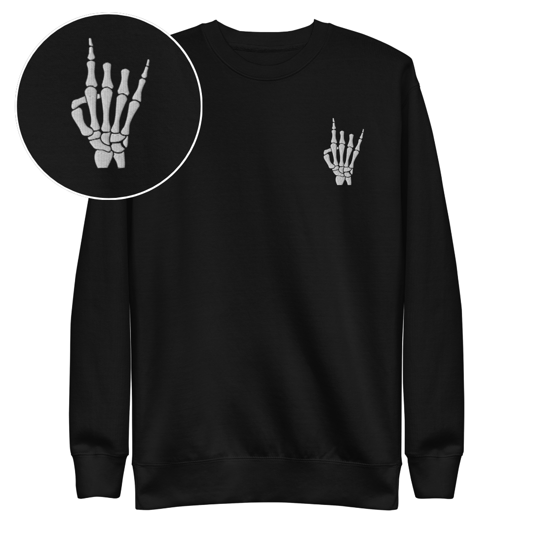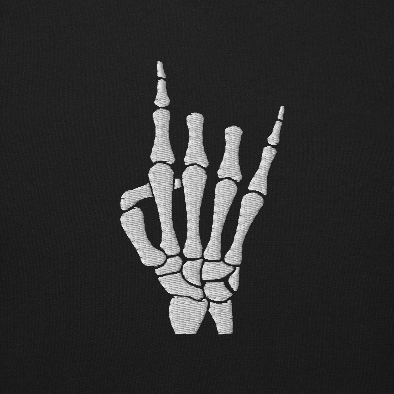Unleash your wild side with the Goth Cloth Co. unisex tattoo-style embroidered sweatshirt. The left chest features a skeleton rock on hand embroidery. This sweatshirt blends classic streetwear with a touch of rebellious edge, making it a perfect choice for those who like their style a little untamed.