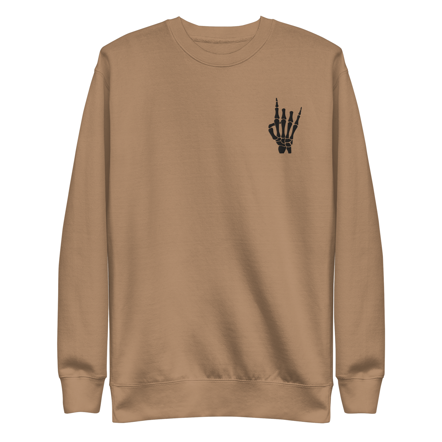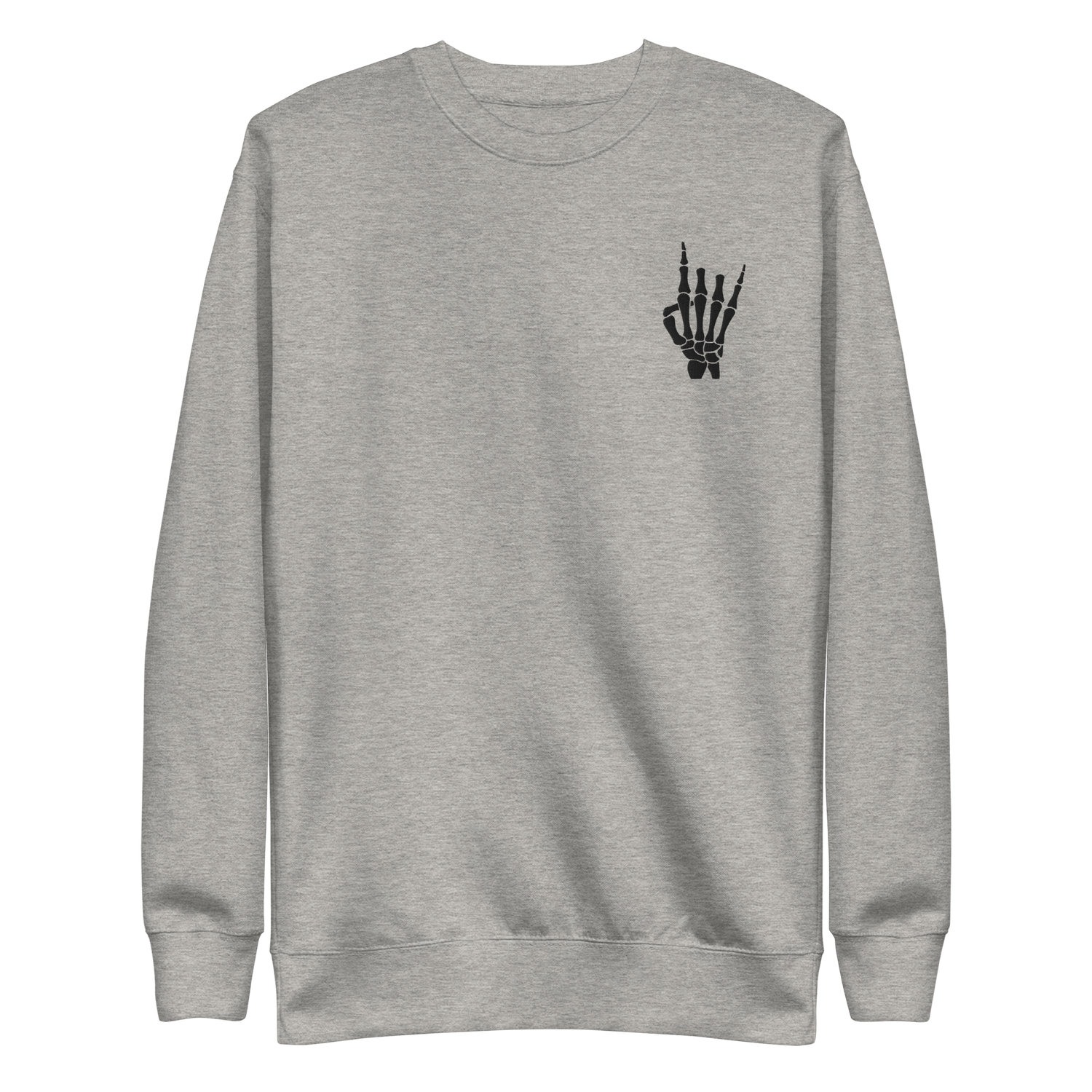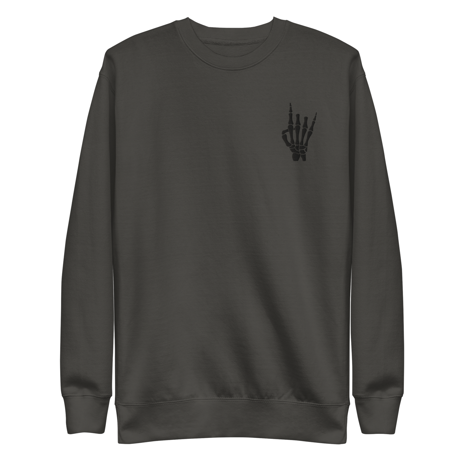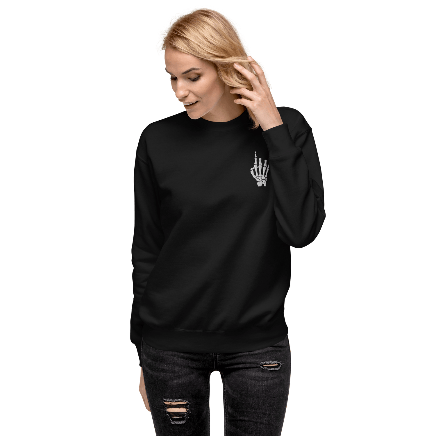 Unleash your wild side with the Goth Cloth Co. unisex tattoo-style embroidered sweatshirt. The left chest features a skeleton rock on hand embroidery. This sweatshirt blends classic streetwear with a touch of rebellious edge, making it a perfect choice for those who like their style a little untamed.